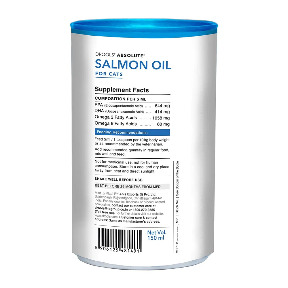 Drools Absolute Salmon Oil for cats provides a daily supply of EPA and DHA, the best Omega-3 fatty acids. This supplement provides a better value of EPA and DHA than plant-based substitutes to support healthy skin, coat and nerve-based functions like cognition and vision. It also boosts the immune system and provides support to joint health for keeping your cat healthy. Added taurine for better eye vision.