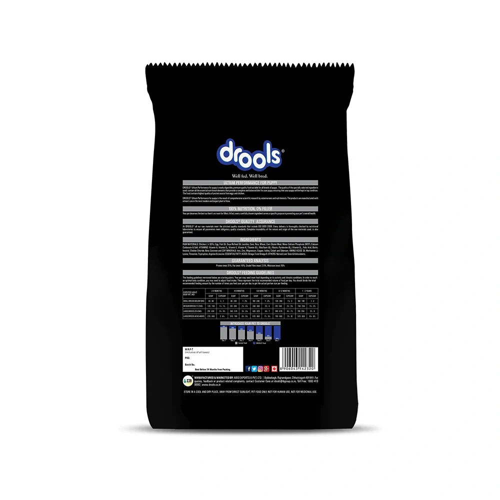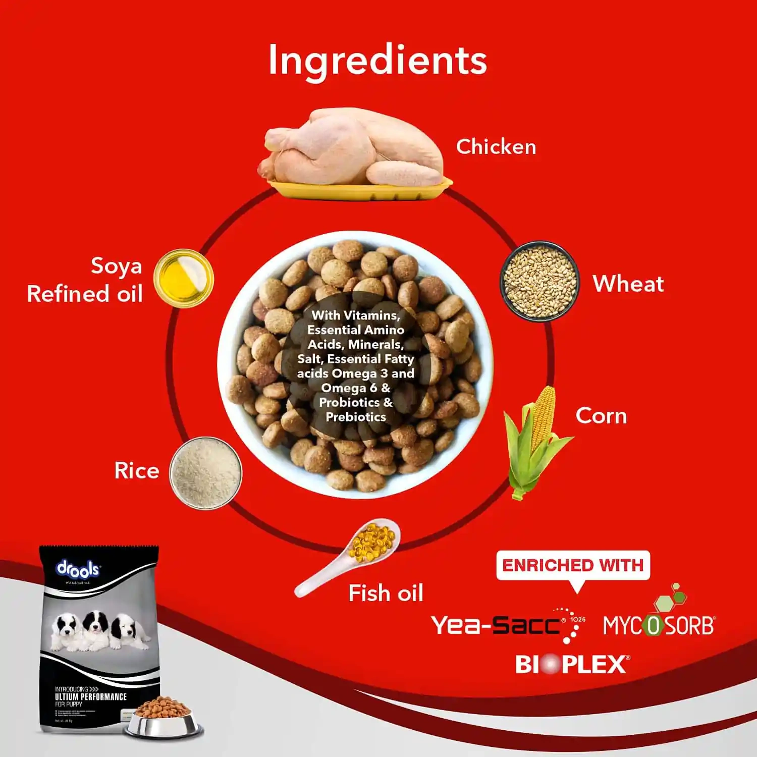 Drools Ultium Performance Adult Dog Food is formulated with higher protein and fat for peak performance, and promoting superior growth and muscle development of your dog. Easily digestible with high quality ingredients, it provides a complete and balanced diet for dogs making them agile and active. In addition to being gut friendly it also supports optimum absorption by your pet. It is enriched with mycosorb, bioplex and yea sacc for better results and improved performance.