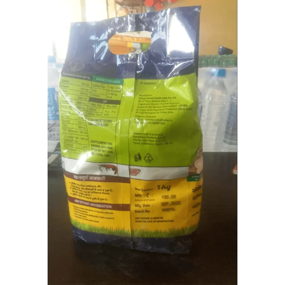 - Cattle and Pig: 1 to 2 kg to be mixed in 100 kg feed or 50 gm daily