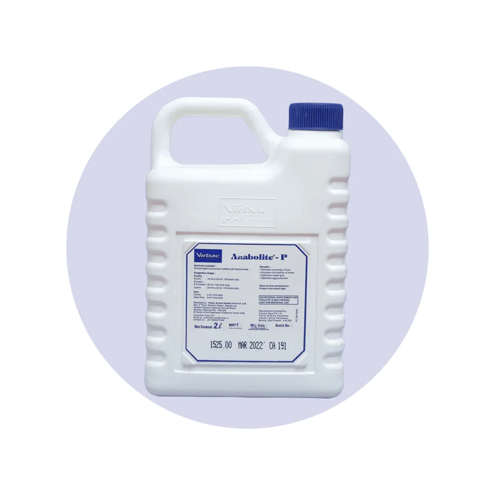 - Broiler & Layer: 10 ml/100 chicks, 20 ml/100 birds once a week