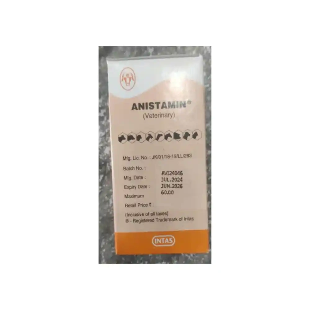 Anistamin Injection 10mg, brought to you by INTAS Pharmaceuticals, is a versatile injectable medicine designed for various animals such as horses, cows, bulls, buffalos, pigs, goats, sheep, camels, and others. Containing Chlorpheniramine, this product is a mainstay in the treatment of a range of allergic reactions, making it a valuable asset in the lineup of quality veterinary products.