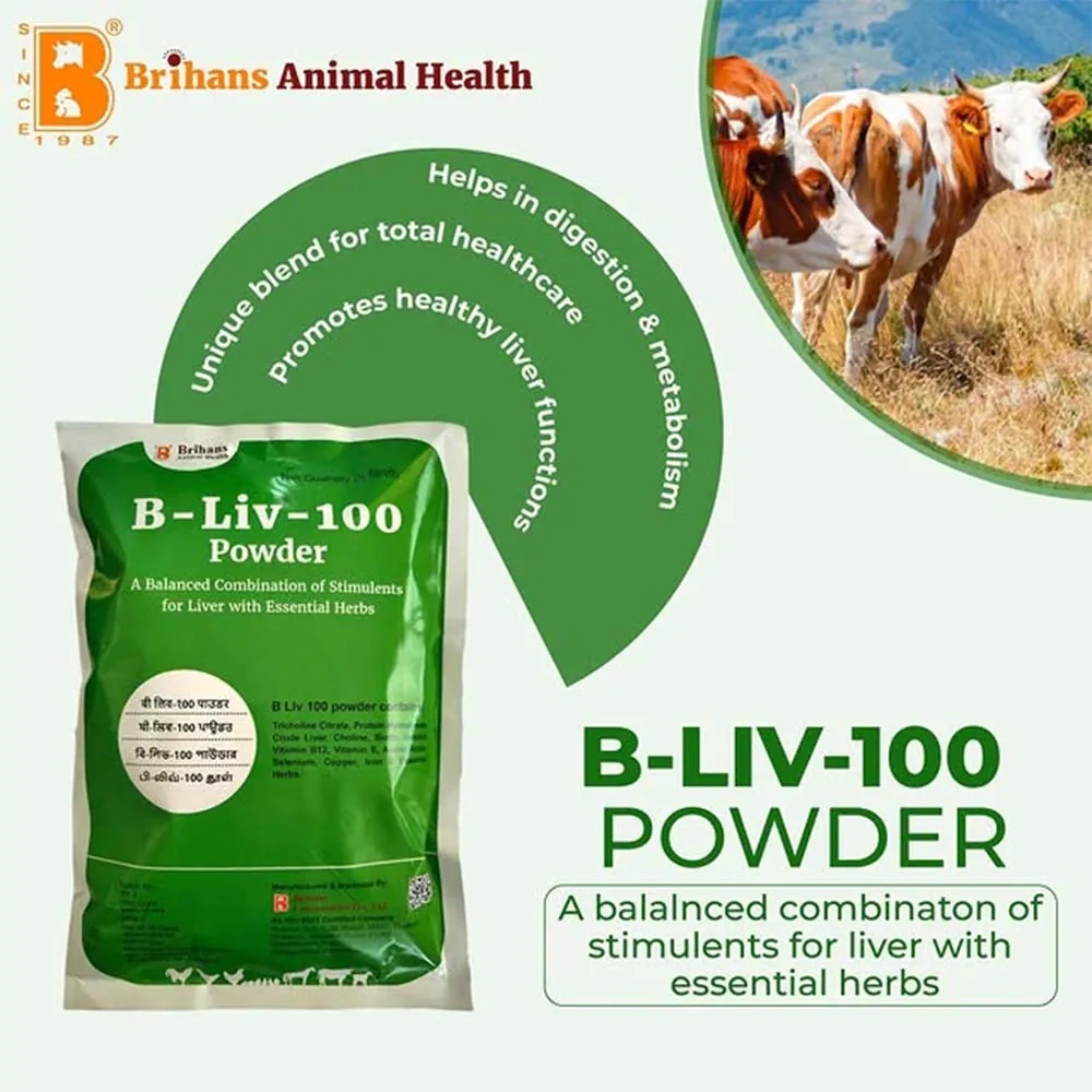 B-Liv-100 Powder is a meticulously formulated liver supplement for cattle, designed to promote optimal liver function and overall animal health. This product combines essential herbs and stimulants, ensuring your livestock maintains a healthy metabolism, robust digestion, and efficient nutrient absorption.