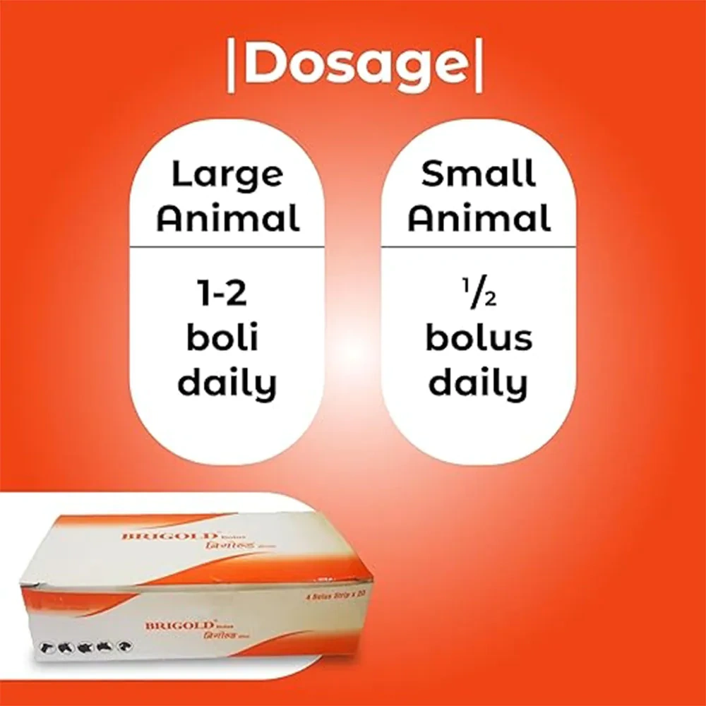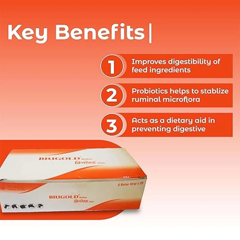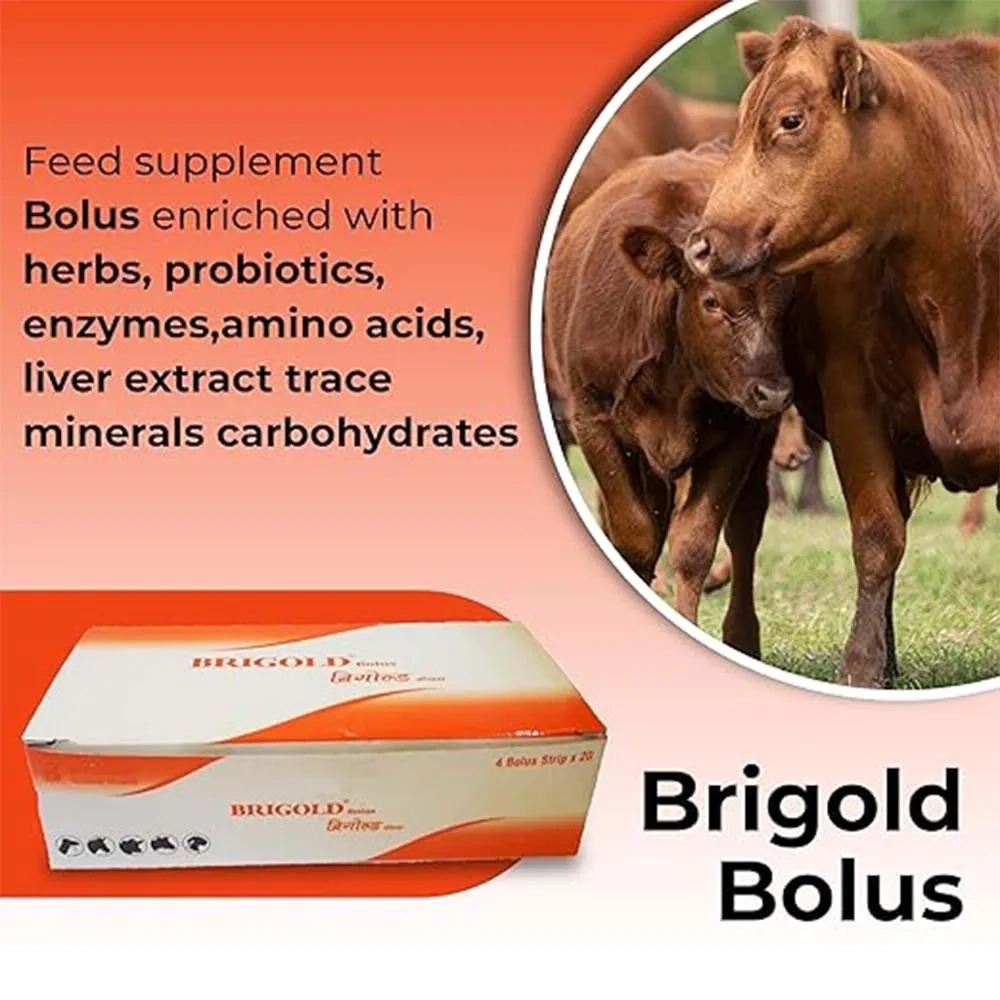 Brigold Bolus is a feed supplement designed to enhance digestion and stabilize ruminal microflora in livestock. It contains a blend of enzymes, amino acids, ginger powder, cobalt, copper, DL-methionine, liver extract, and yeast powder with dextrose. This formulation aids in improving the digestibility of feed ingredients and acts as a dietary aid in preventing digestive disorders.