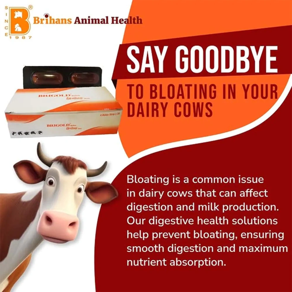 Brihans Animal Health’s Brigold Bolus feed supplement contains a variety of beneficial ingredients such as Enzymes, Amino Acids, Ginger Powder, Cobalt and Copper, Liver Extract. By incorporating this feed supplement into their diets, producers can help optimize the health and performance of their livestock, leading to improved productivity and profitability.