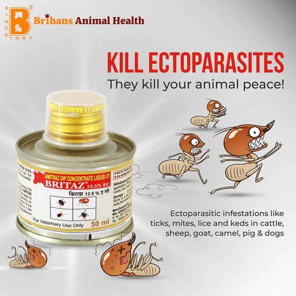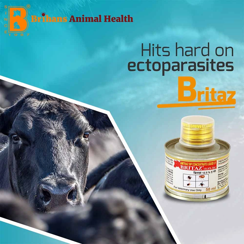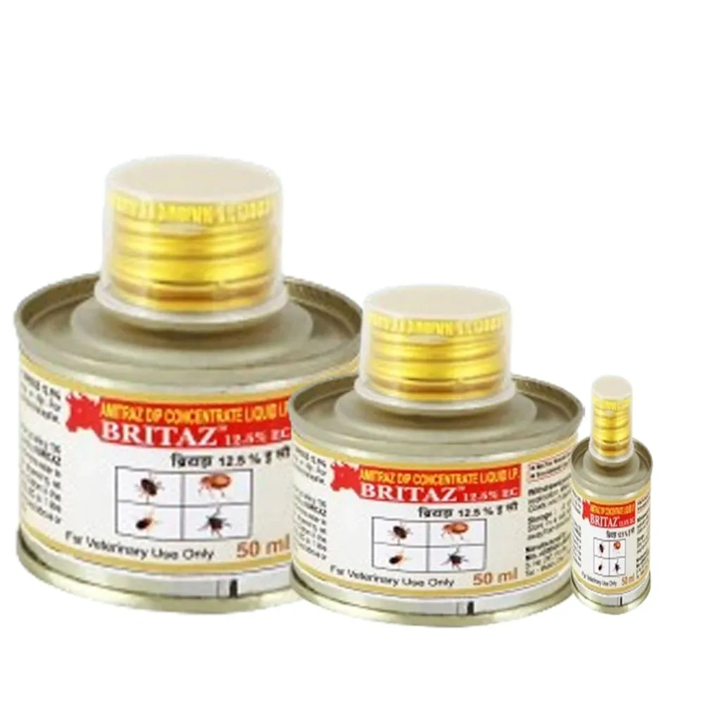 Dip or Spray: Prepare a premix by taking 100 ml of water with the required quantity of BRITAZ 12.5% EC (refer to the dosage in the leaflet). Add more water to make up the volume to 1 litre. Depending on the number of animals, prepare the dilution in the same ratio of BRITAZ 12.5% EC to 1 litre of water as per the dosage mentioned OR as directed by the Veterinarian.