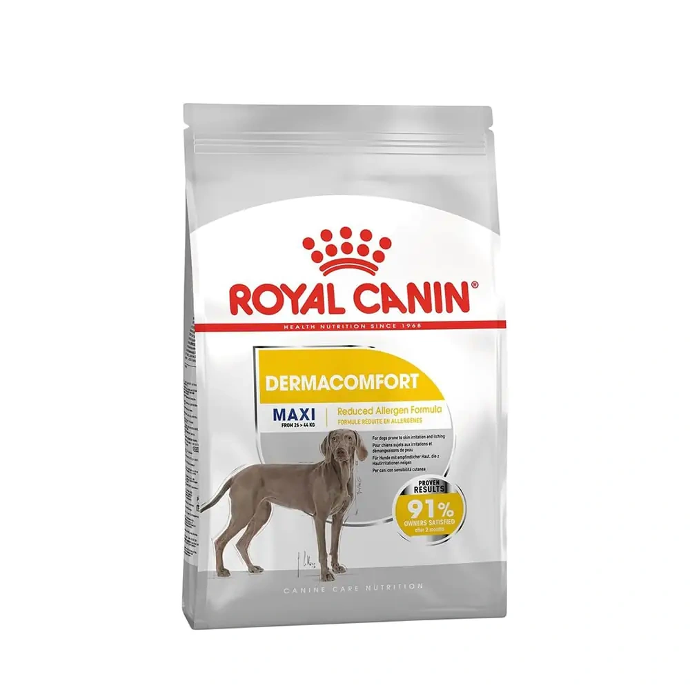 ROYAL CANIN Dermacomfort Maxi is a specially formulated dry dog food designed to support and soothe sensitive skin in adult and mature large-breed dogs (26-44 kg) over 15 months old. It helps reduce skin irritation and promotes a healthy coat with Omega-3 and Omega-6 fatty acids, including GLA, EPA, and DHA. This product is suitable for dogs prone to itching and skin sensitivities caused by dietary, seasonal, or environmental irritants.