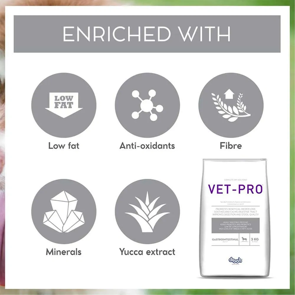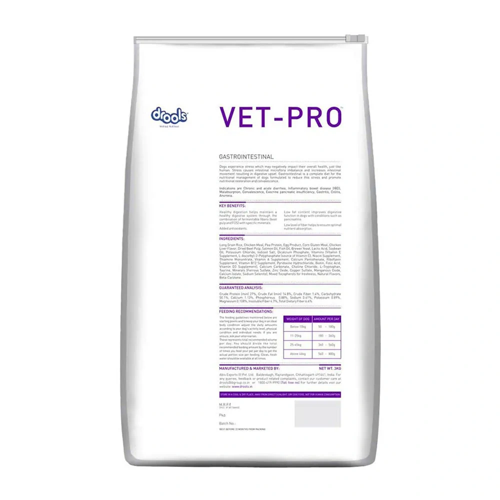 Dogs experience stress which may negatively impact their overall health, just like humans. Stress causes intestinal microflora imbalance and increased intestinal movement resulting in indigestion. VET-PRO Gastrointestinal is a complete diet to aid nutritional management of dogs with Gastrointestinal disorders and to promote digestive health.