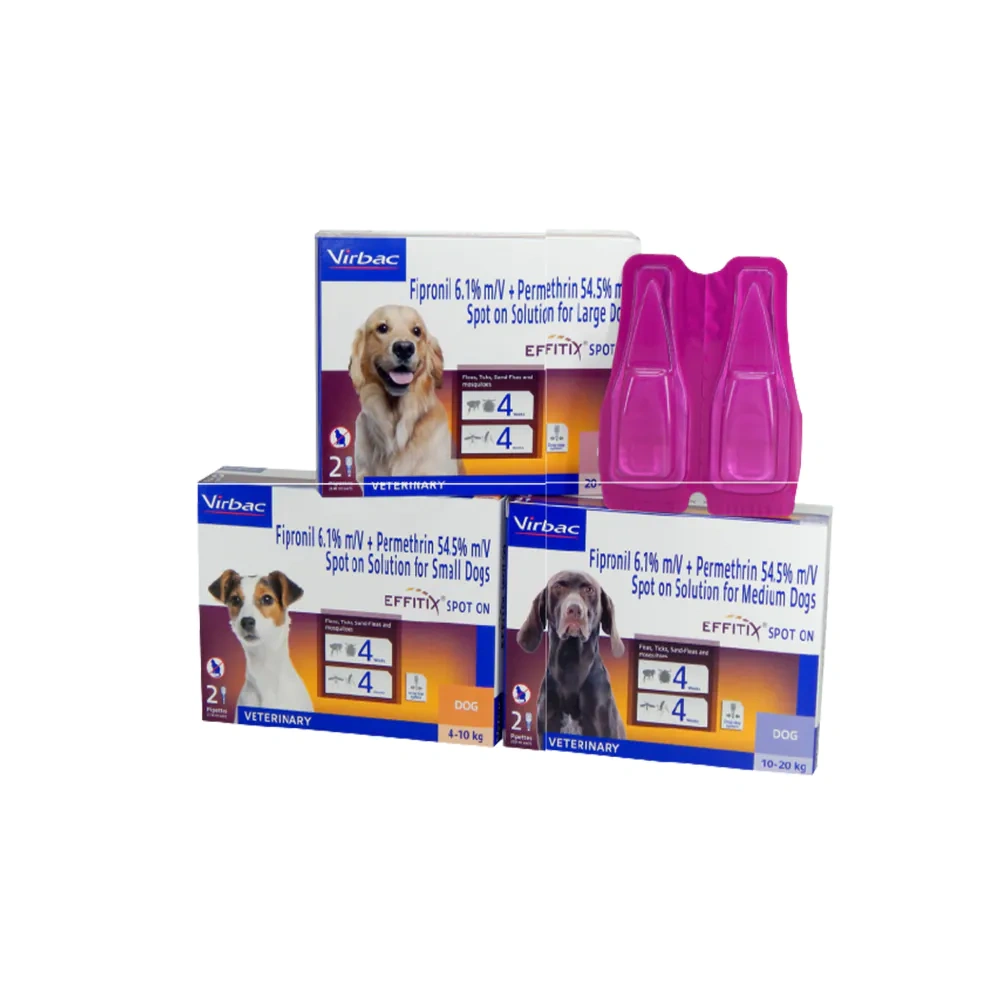 Effitix Spot-On is a combination of Fipronil and Permethrin formulated for dogs, used to treat infestations of fleas and/or ticks while also providing repellent (anti-feeding) action against sand flies and mosquitoes.