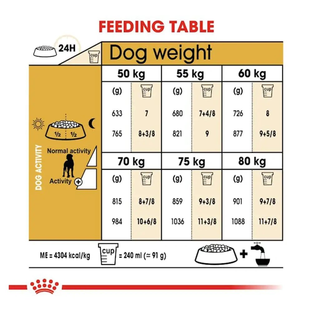 Dog weight | 50 kg | 55 kg | 60 kg | 65 kg | 70 kg | 75 kg | 80 kg |