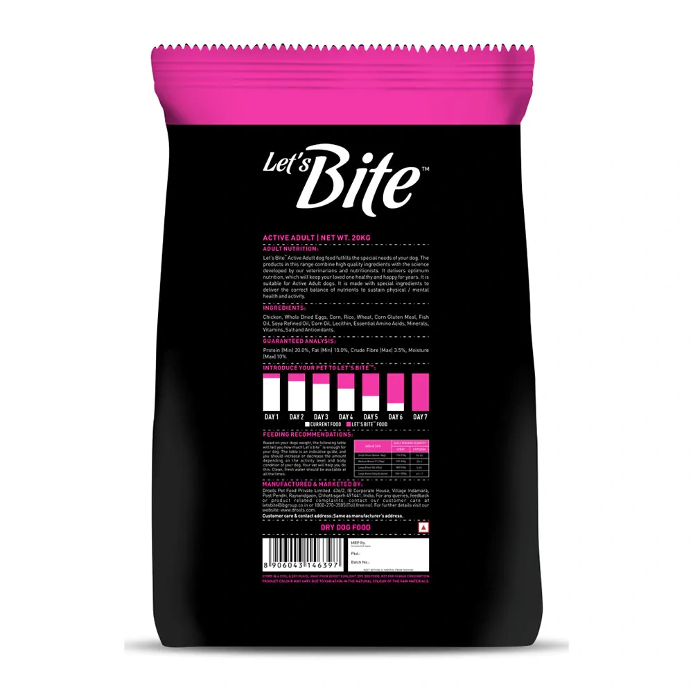 Feed Let’s Bite Chicken Active Adult according to your dog’s weight, breed, and activity level. Follow the feeding recommendations on the packaging to ensure the proper portion size. Make sure fresh water is always available for your dog.