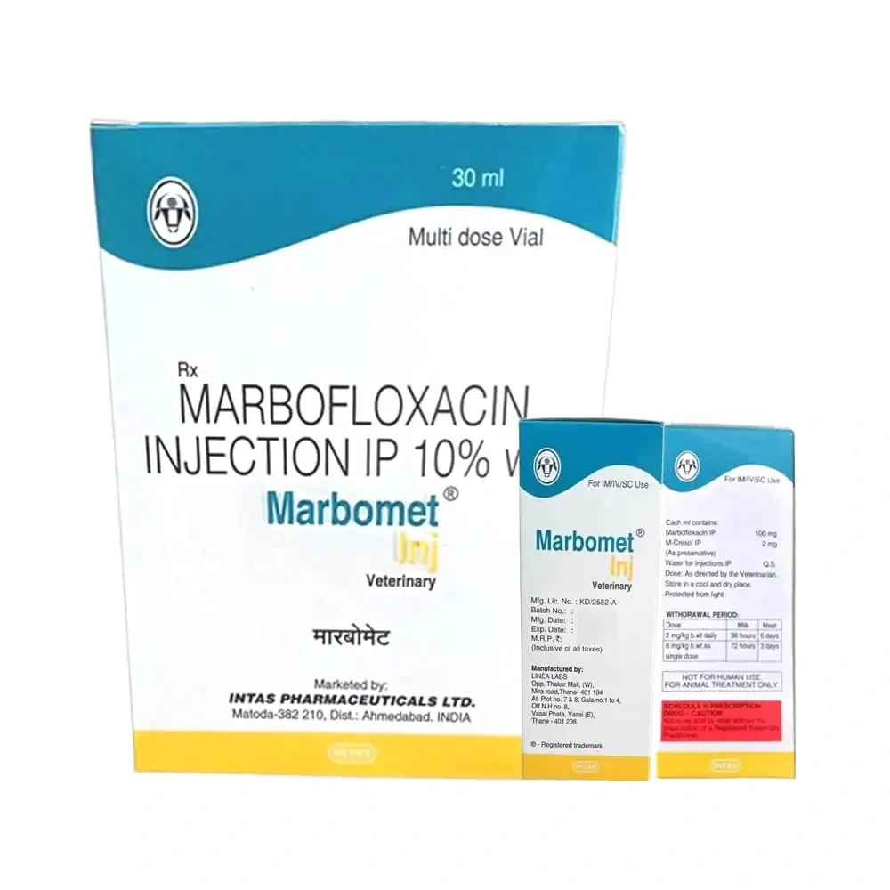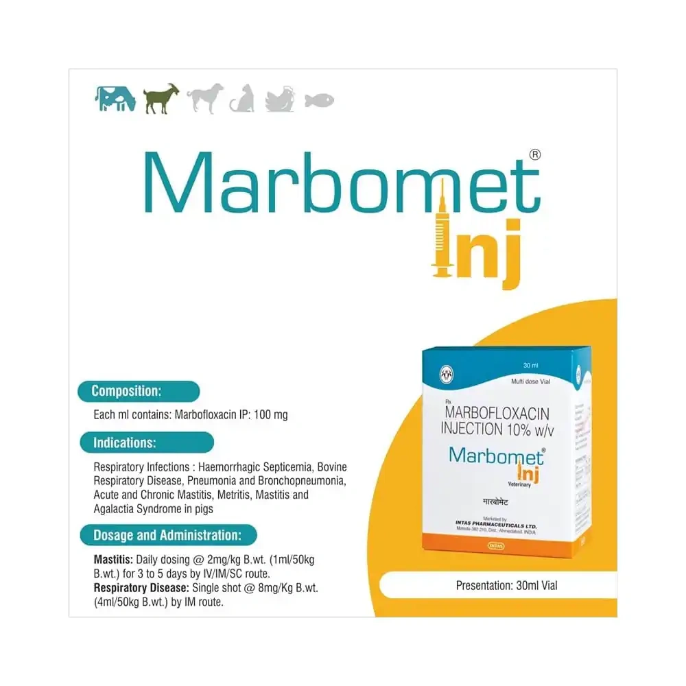 MARBOMET INJ 10% W/V is used for treating Respiratory Infections like Haemorrhagic Septicemia, Bovine Respiratory Disease, Pneumonia, Bronchopneumonia, Acute and Chronic Mastitis, Metritis, and Mastitis and Agalactia Syndrome in pigs.