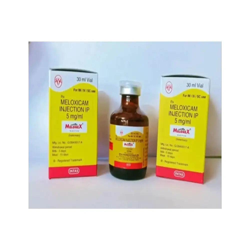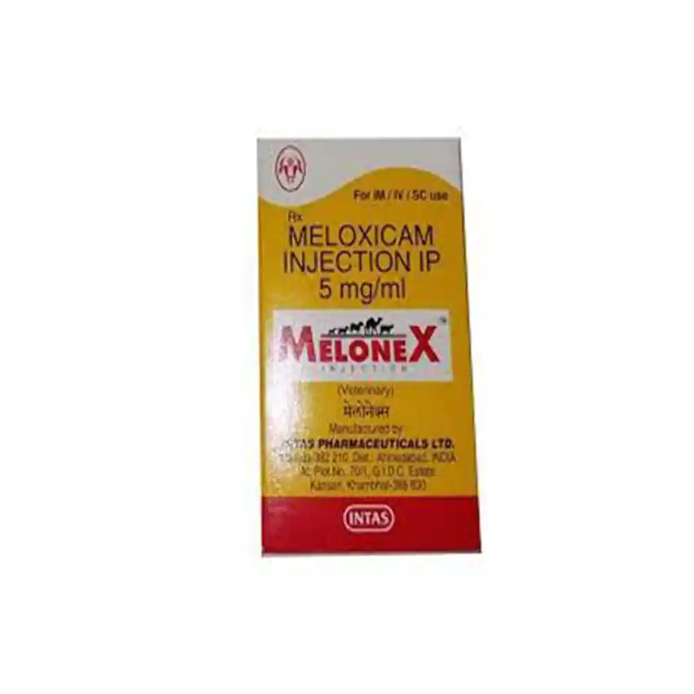 MELONEX INJ is a versatile and effective INJECTABLE medication in the MEDICINE category, produced by INTAS. It’s designed for a broad range of animals including dogs, cats, cows, horses, goats, pigs, buffaloes, bulls, camels, sheep, hamsters, guinea pigs, and rabbits. Each ml of MELONEX INJ contains 5mg of Meloxicam, a non-steroidal anti-inflammatory drug (NSAID) known for its efficacy in treating pain and inflammation. The medication is available in vials of 100ML and 30ML sizes.