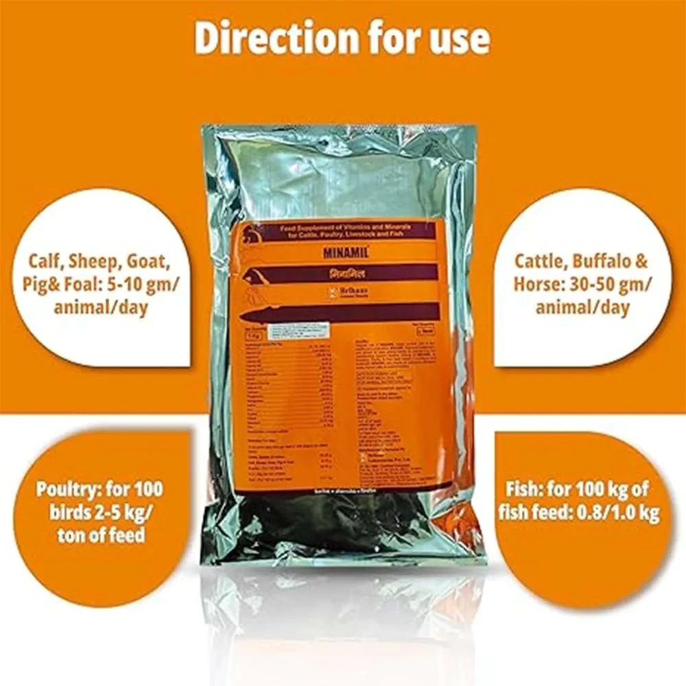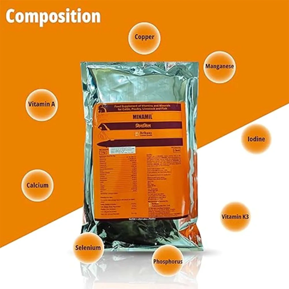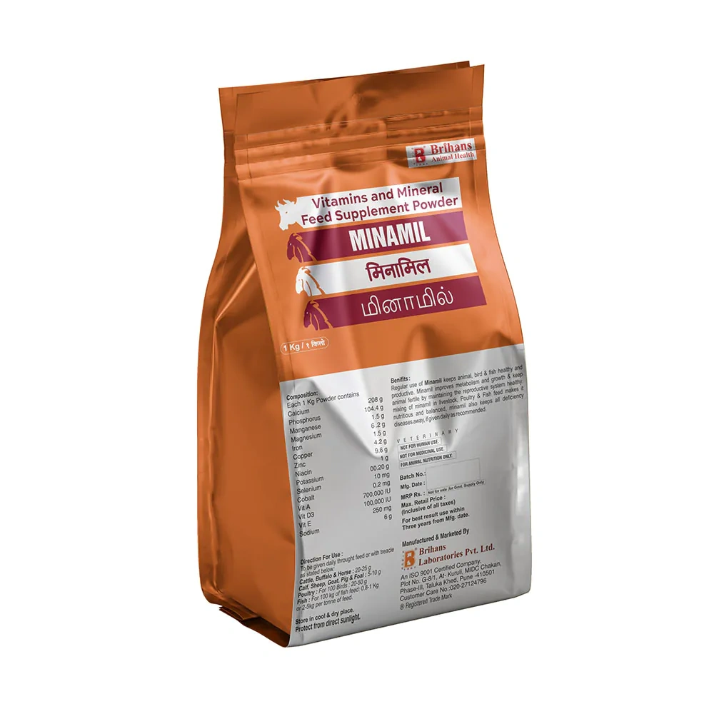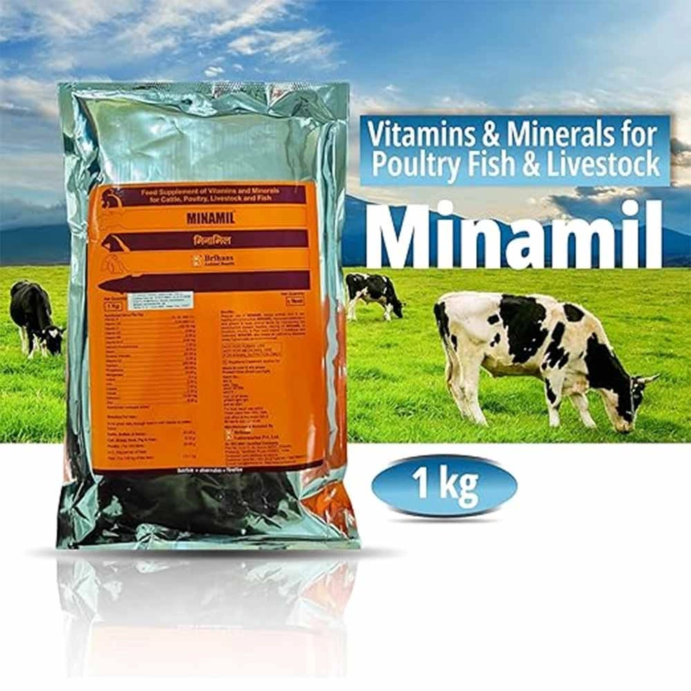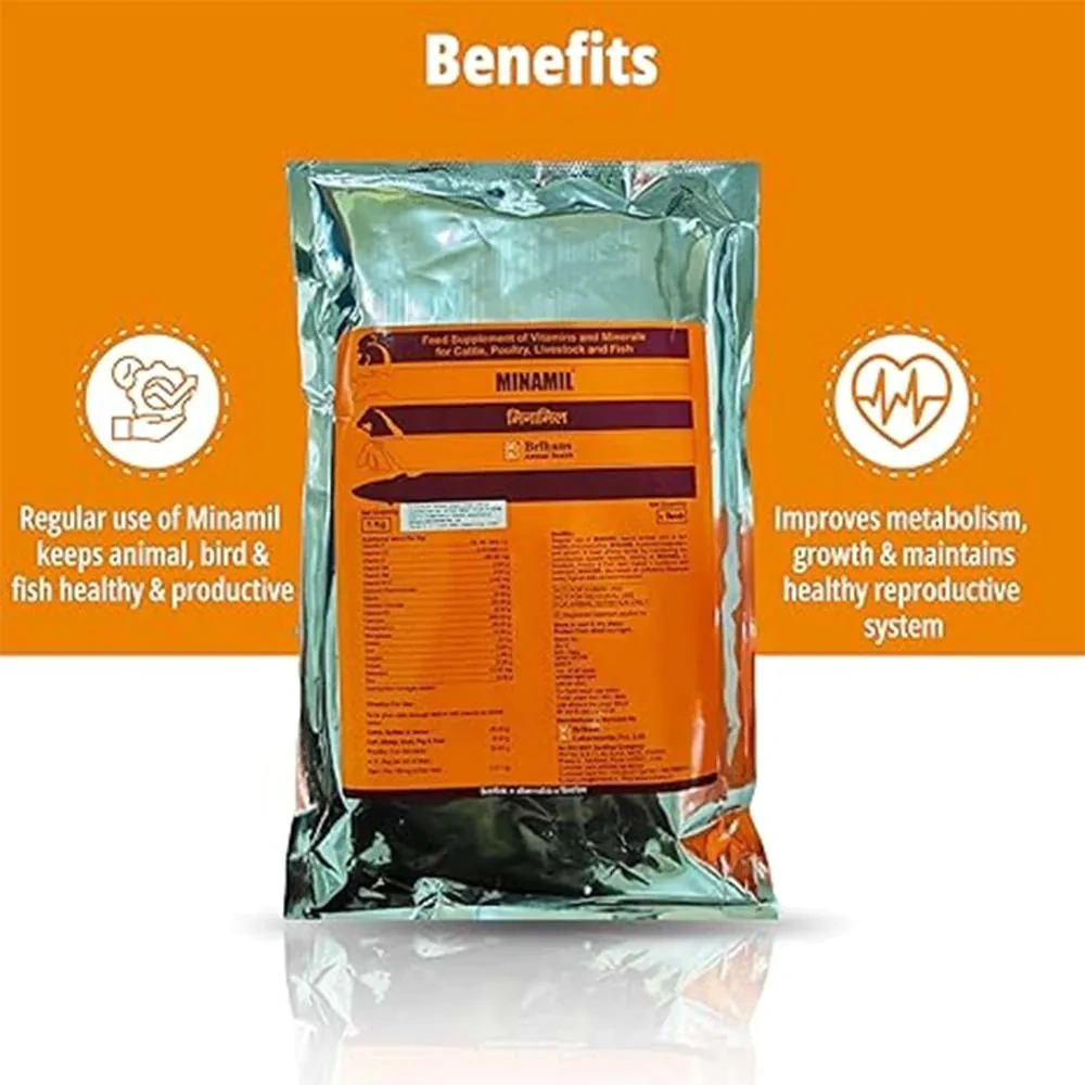 Brihans Minamil is a comprehensive vitamin and mineral supplement formulated to enhance the health and productivity of poultry, livestock, and fish. It contains a balanced blend of 10 essential vitamins and 9 vital minerals.