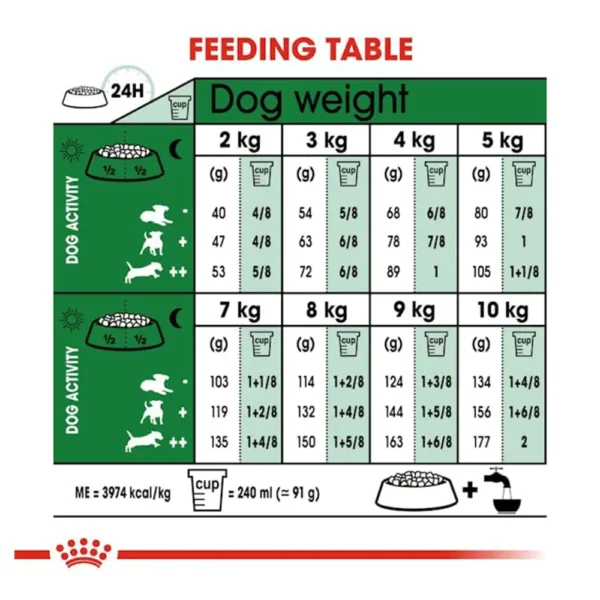 Refer to the feeding table for daily portions based on your dog’s weight and activity level. Ensure access to fresh water at all times.