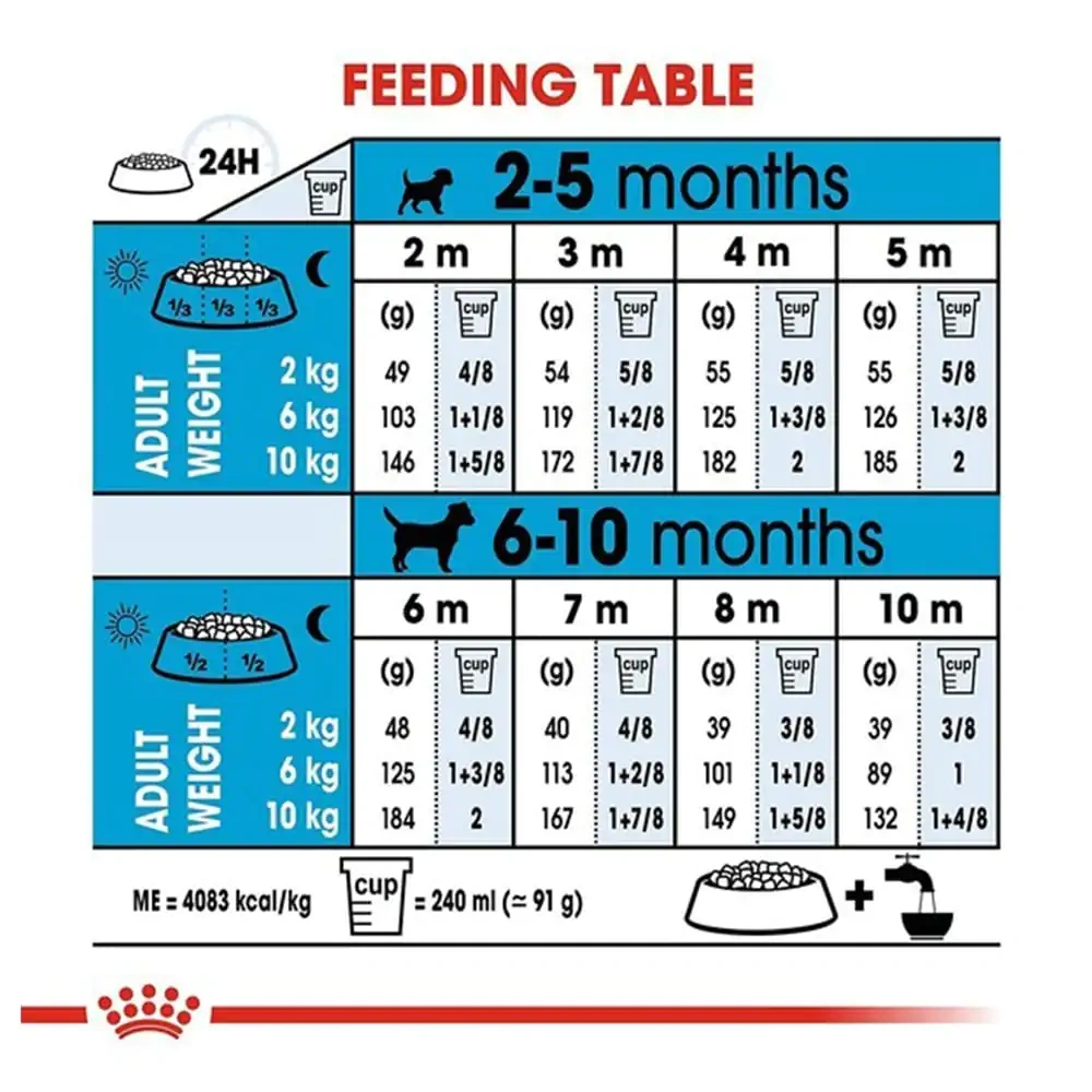 Serve as per the feeding table on the packaging. Adjust the quantity based on the puppy’s age, weight, and activity level. If using mixed feeding, ensure the balance of wet and dry food follows the guidelines provided.