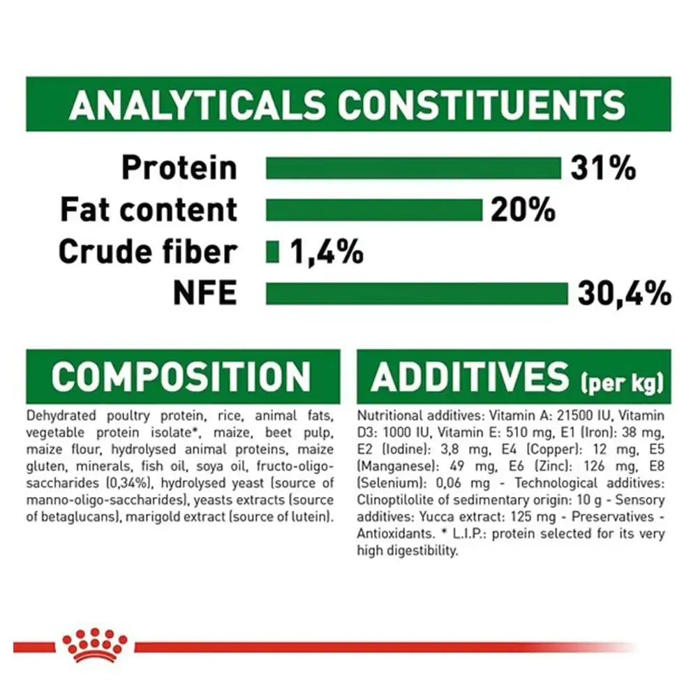 This formula contains meat and animal derivatives, cereals, oils, and fats to support the unique nutritional needs of small breed puppies during their growth period. It is designed to aid immune system development, digestive health, and high energy requirements.