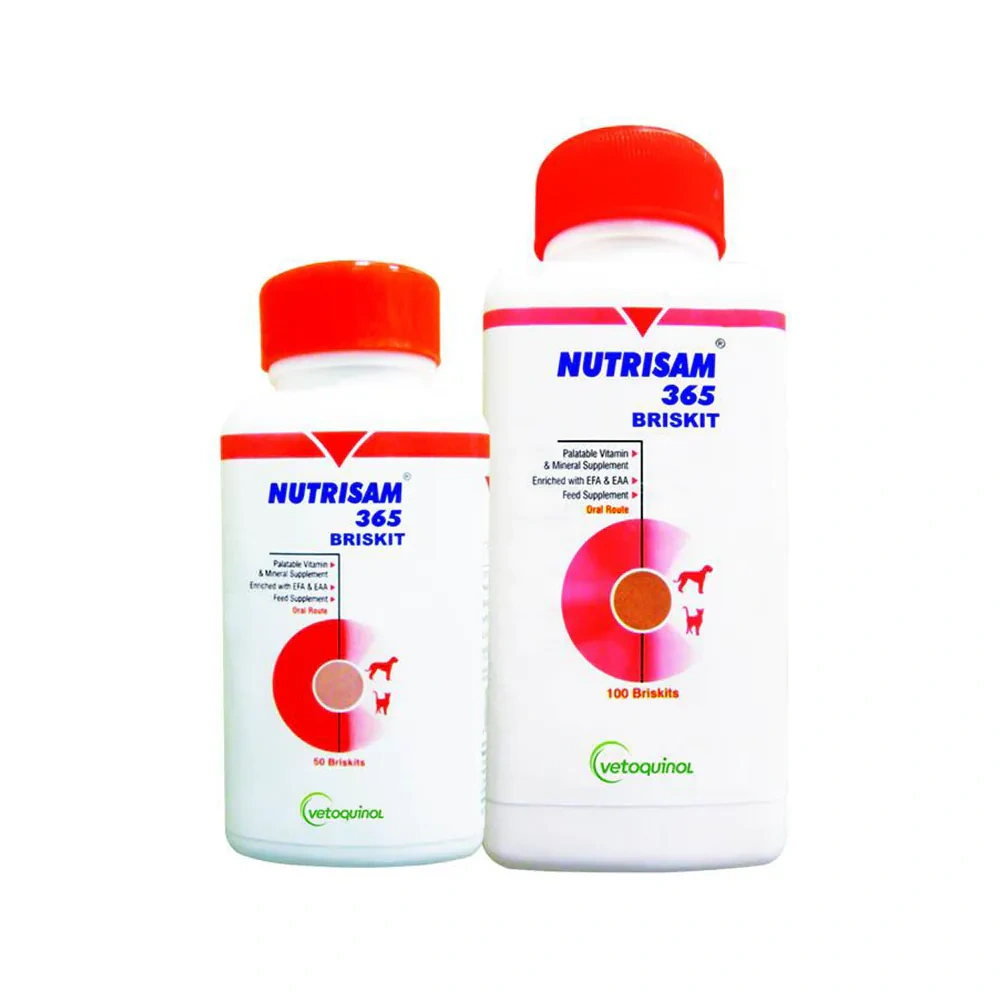 Vetoquinol Merical Briskit Calcium supplement -100 Tablet It is a perfect calcium and phosphorus supplement for your pet FEATURES Supplement with Scientific Calcium and Phosphorous ratio (1.29:1) Can be used for all breeds and all ages of dogs in all physiological stages throughout the year Highly palatable for spontaneous intake SPECIFICATIONS Number of Tablets – 100 Tablets Feeding Directions – Pups and Cats – (half) briskit daily Dogs – 1-2 briskits daily,