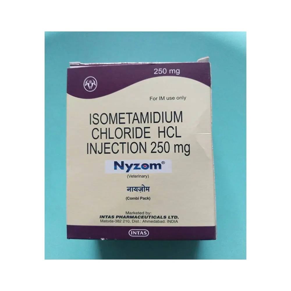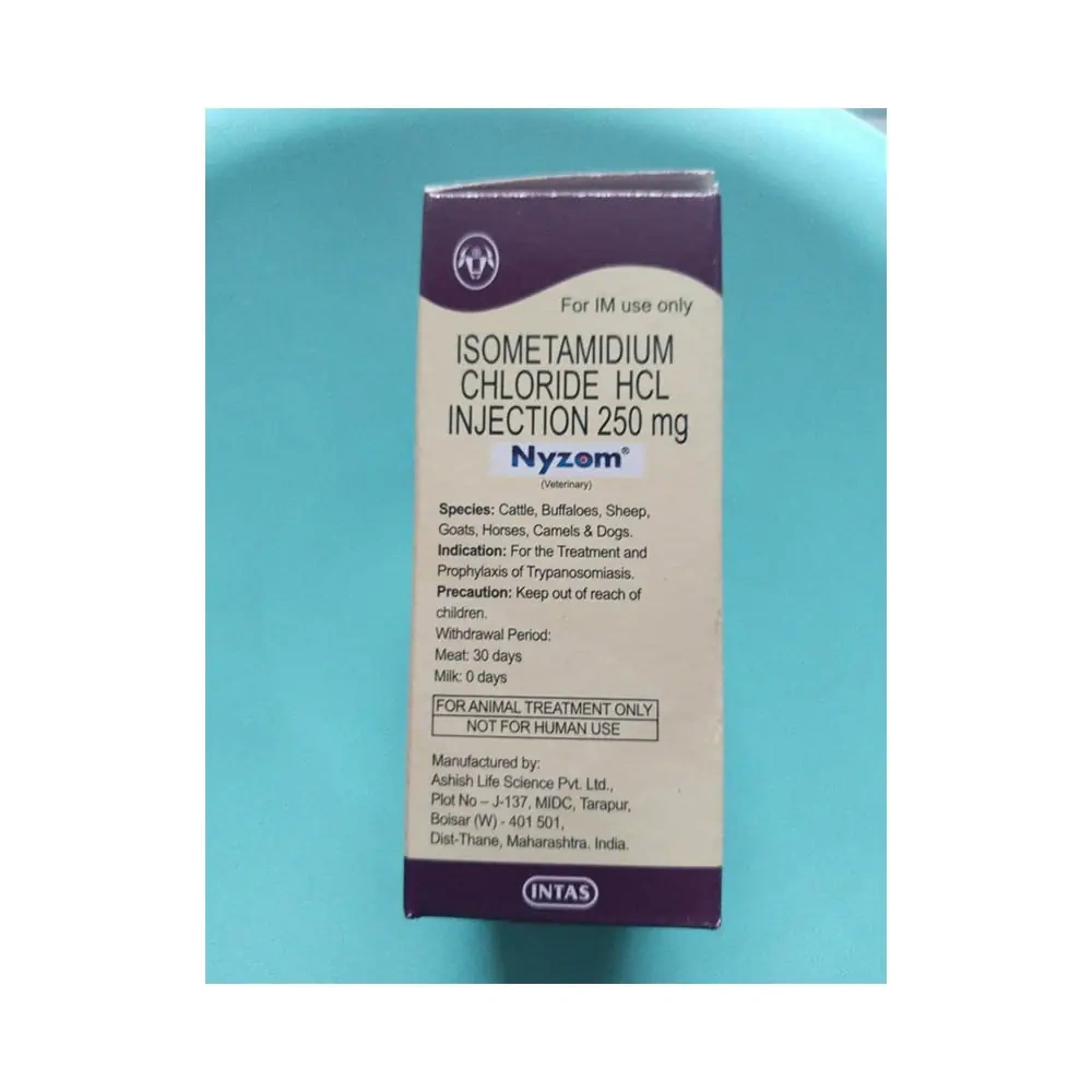 Introducing NYZOM INJ, a highly effective veterinary medicine designed for the treatment and prevention of trypanosomiasis in a range of animals including cattle, goats, sheep, camels, horses, and dogs. This product, featuring the active ingredient Isometamidium chloride HCl 250 mg, is a testament to the commitment to providing quality healthcare solutions for various animal species.