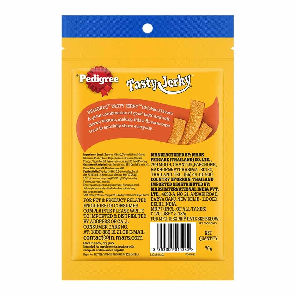 Pedigree Tasty Jerky Chicken and Liver Flavour Adult Dog Treat is a jerky-style treat made with chicken liver cut into long, thin strips and dried, that helps you bond with your dog. Made with quality ingredients, it is a source of minerals and antioxidants (Vitamin E as an antioxidant). It contains Omega 6 and is a high protein healthy treat with low fat. It also contains calcium to support healthy bones.