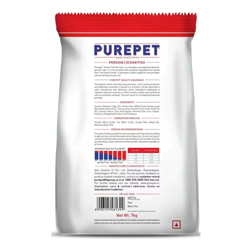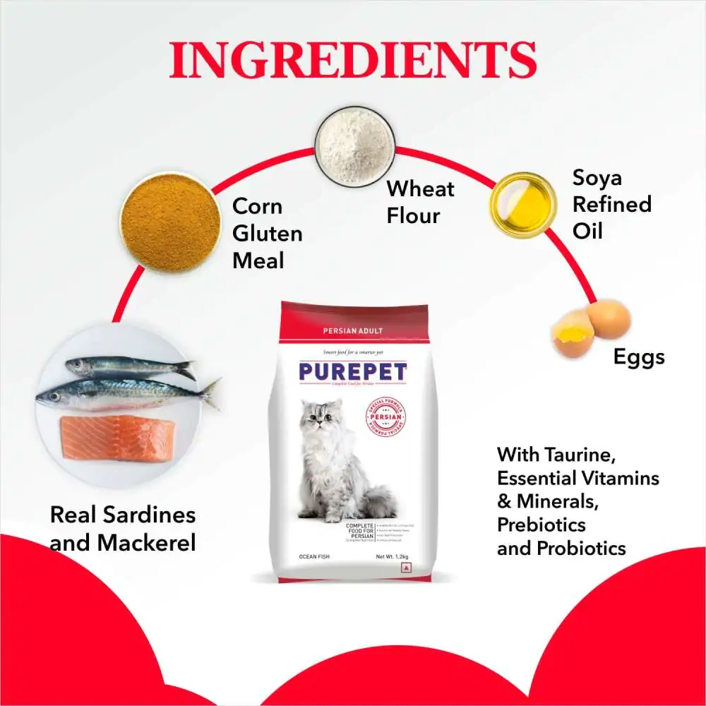 Purepet Ocean Fish Persian Adult Cat Dry Food Is a nutritious food that is made of ocean fish. This formulation contains key vitamins which help keep the coat beautiful and lustrous. The blend of Organic Minerals along with the essential ingredients help to control Urinary pH. Prebiotics and Probiotics help improve the digestive system and protect from hairball formation which is important for Persian Cats. The digestive system, teeth and jaws of cats are specifically adapted and suited to eat meat. Fish consists of quality source protein, which is necessary in the cat’s diet to prevent any kind of damage in the body. This delicious food is formulated with the same balance of nutrients providing all the health benefits to your Persian cat.