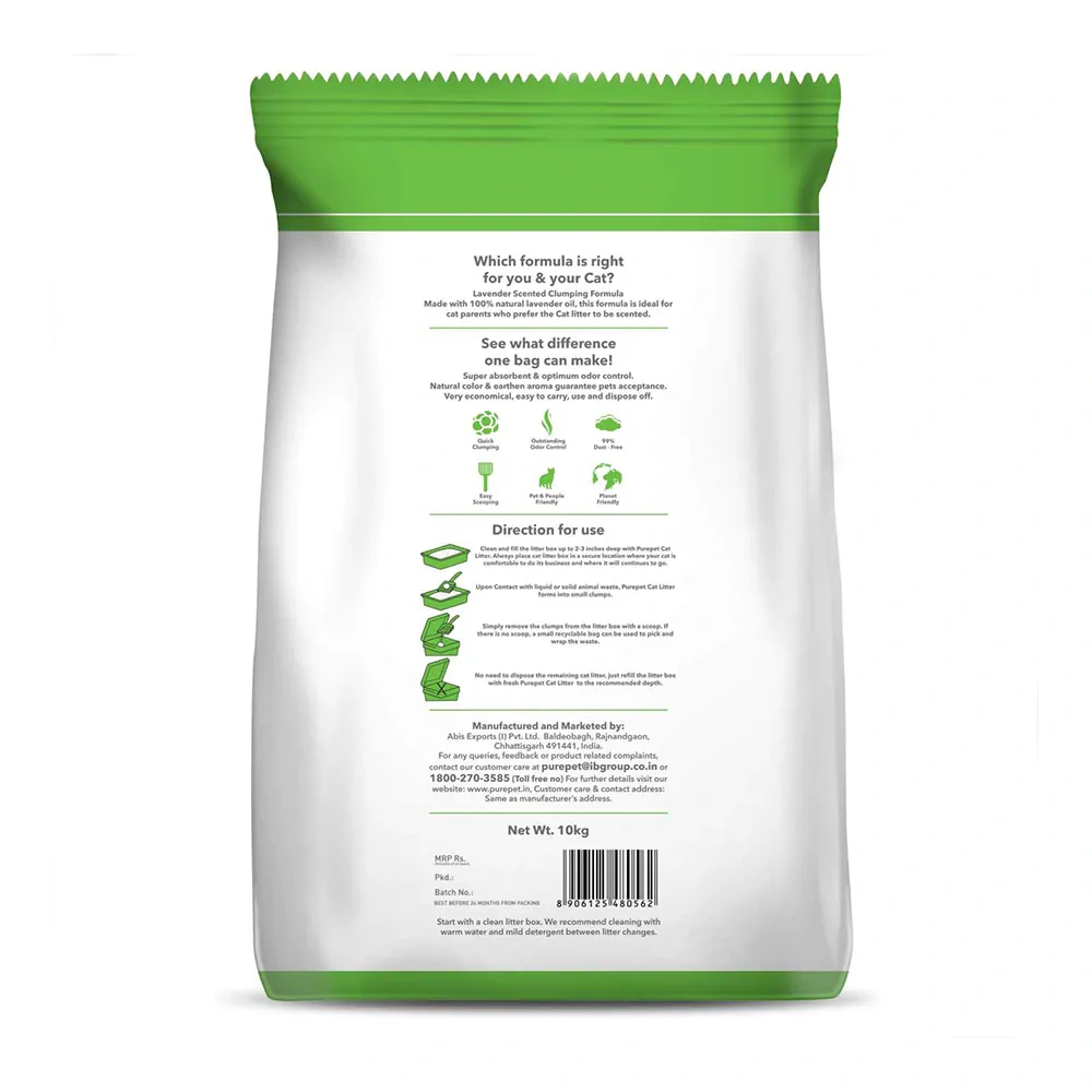 Purepet Lavender scented clumping Cat Litter formula which is made with pure and natural bentonite clay and natural lavender oil for excellent absorbency and odour control. It is ideal for cat parents who prefer cat litter to be scented and obsessed with pets. It is a 100% dust-free and chemical-free formula.