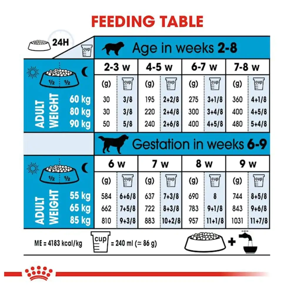 Refer to the detailed feeding chart based on the dog’s weight and stage of gestation or lactation. Adjust quantities as per the recommendations provided on the packaging.