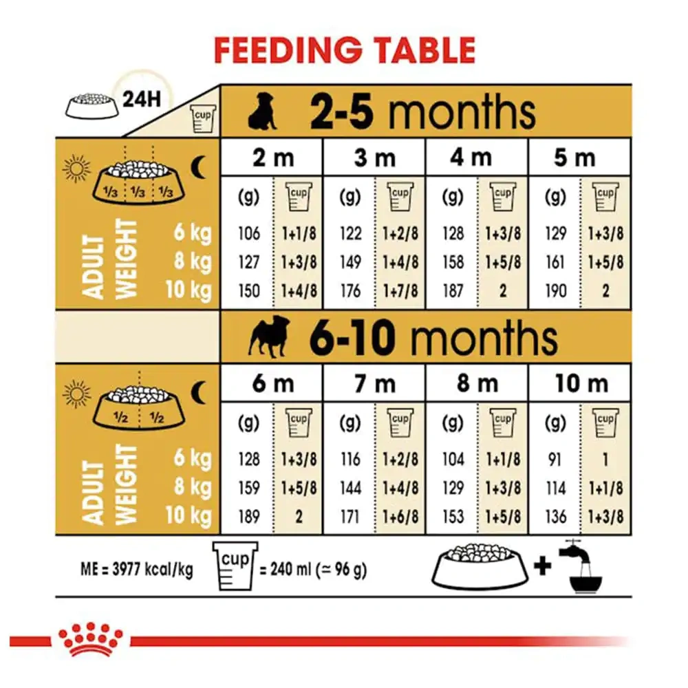 Feed as per daily feeding recommendations on the packaging. Transition to Pug Adult formula after 10 months. Ensure fresh drinking water is available at all times.