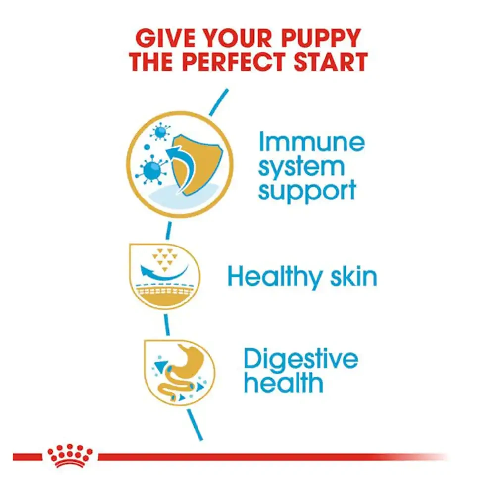 ROYAL CANIN® Pug Puppy contains a blend of dehydrated poultry protein, rice, maize, and essential oils. It is designed specifically for young Pugs to support their immune system, skin health, and digestive well-being during their key growth phase.