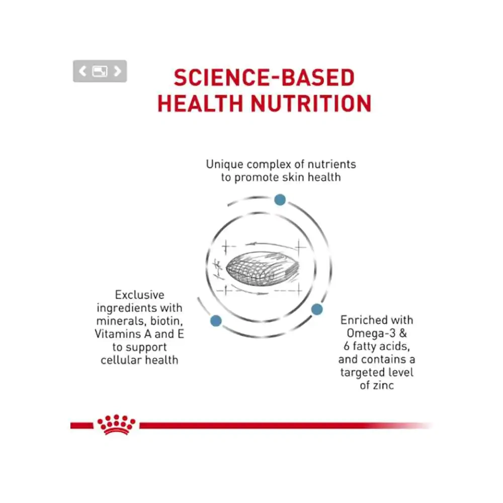 This diet contains a blend of dehydrated poultry protein, rice, maize, wheat, animal fats, and hydrolyzed poultry liver, enriched with EPA/DHA and linoleic acid. It is designed for adult dogs over 10kg with skin issues such as atopic dermatitis, itching, and environmental allergies.