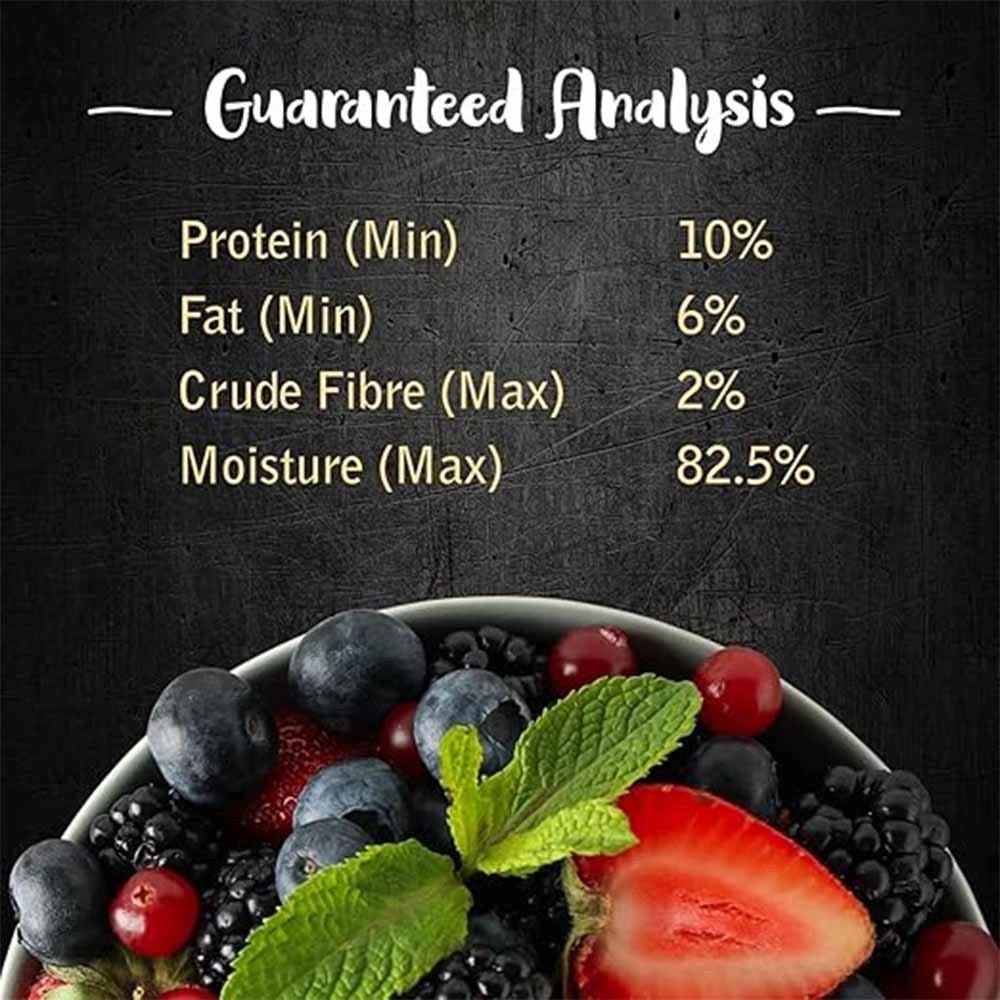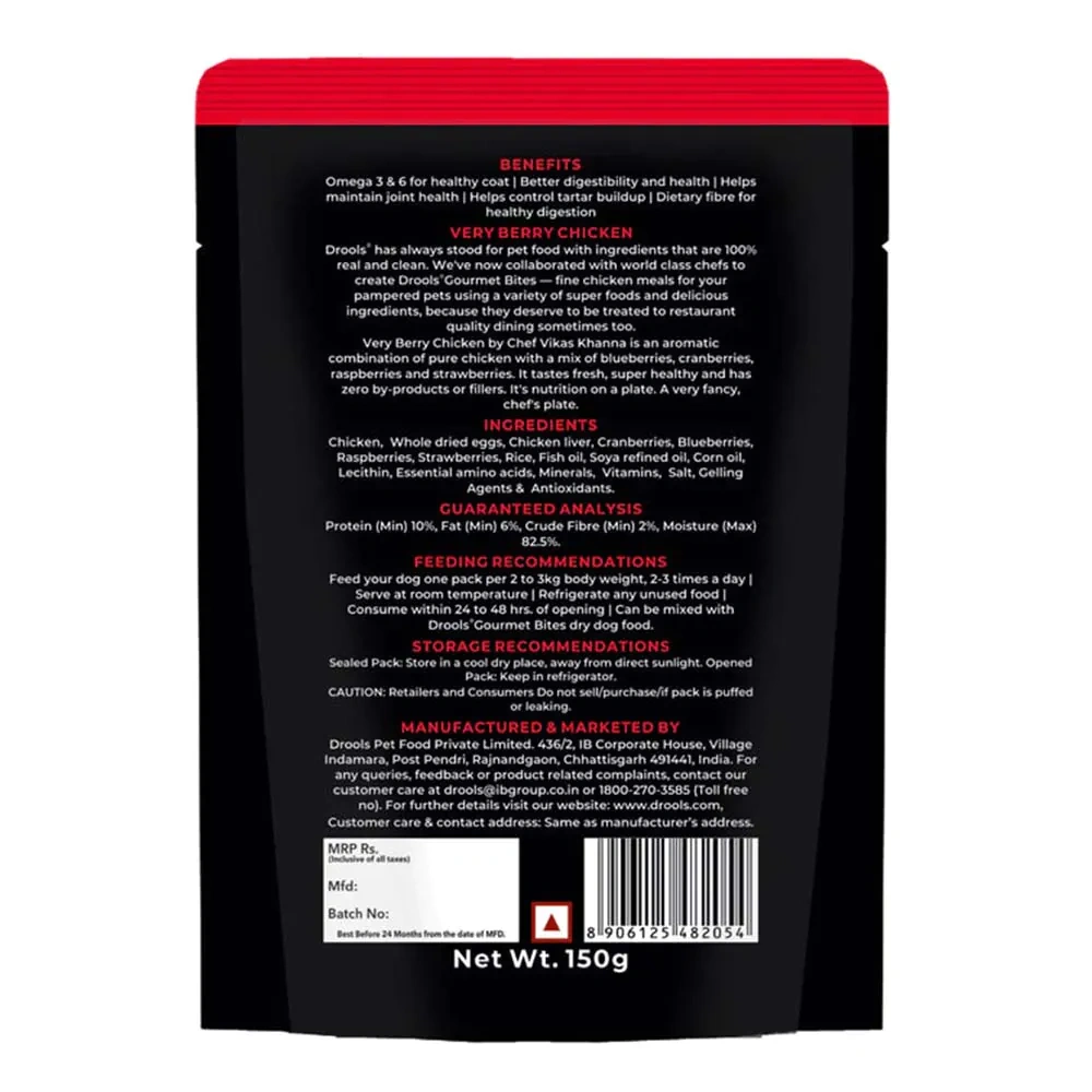 Drools Gourmet Bites Vikas Khanna Recipe Very Berry Chicken Puppy Wet Food is farm fresh recipe starts with Real Chicken mixed with a healthy blend of superfoods such as cranberries, blueberries, raspberries and strawberries that are loaded with the goodness of antioxidants to make your puppy thrive. This gravy can be mixed with dry kibble to add variety or served on its own. Formulated with Omega 3 and 6 fatty acids this recipe supports brain, eye and cognitive development, and enhances a shiny, healthy coat.