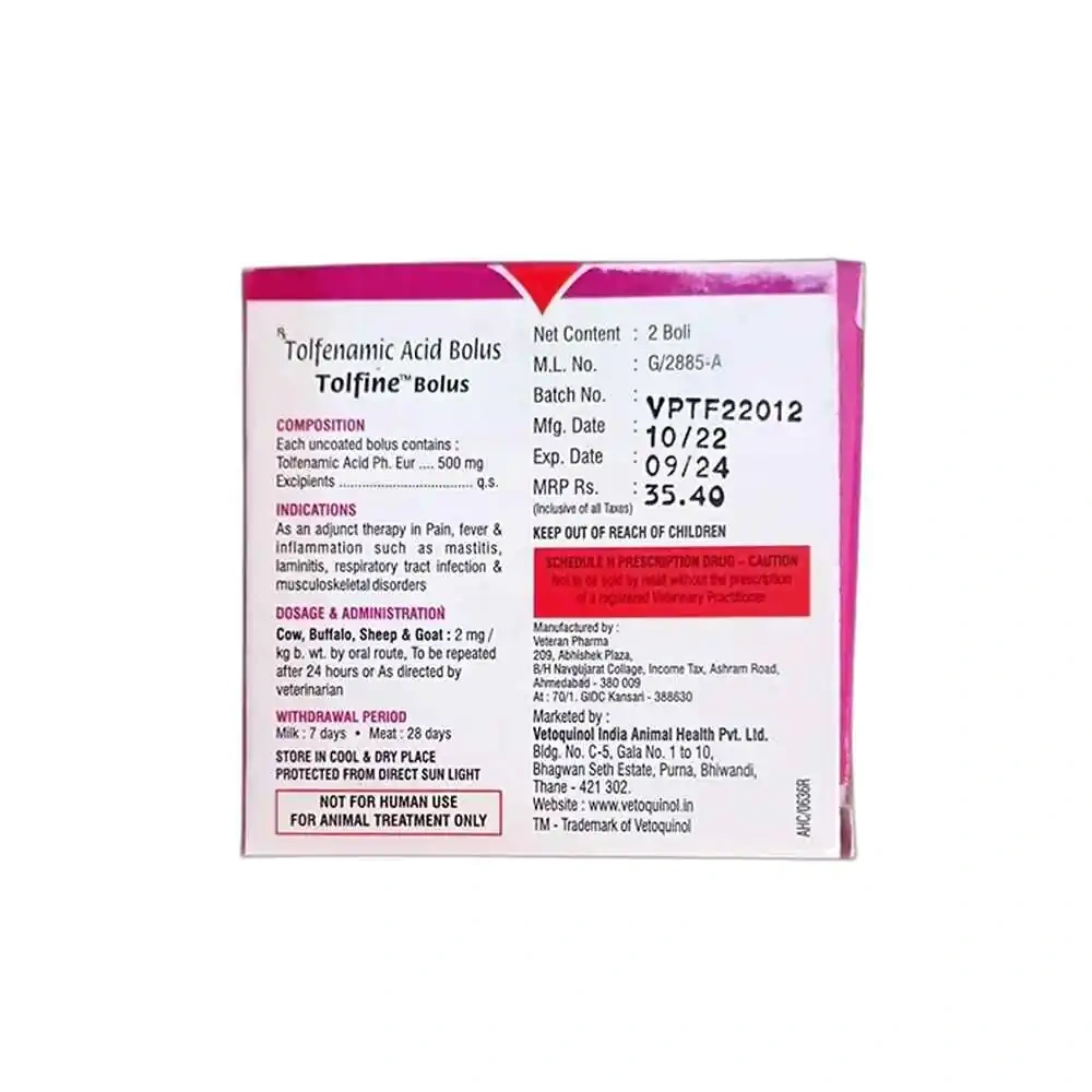 Tolfine™ Bolus contains Tolfenamic Acid (500 mg), which provides anti-inflammatory and analgesic effects. It is used to treat pain, fever, and inflammation in cattle, dogs, cats, and pigs. It is commonly used as an adjunct therapy for mastitis, laminitis, respiratory infections, and musculoskeletal disorders.