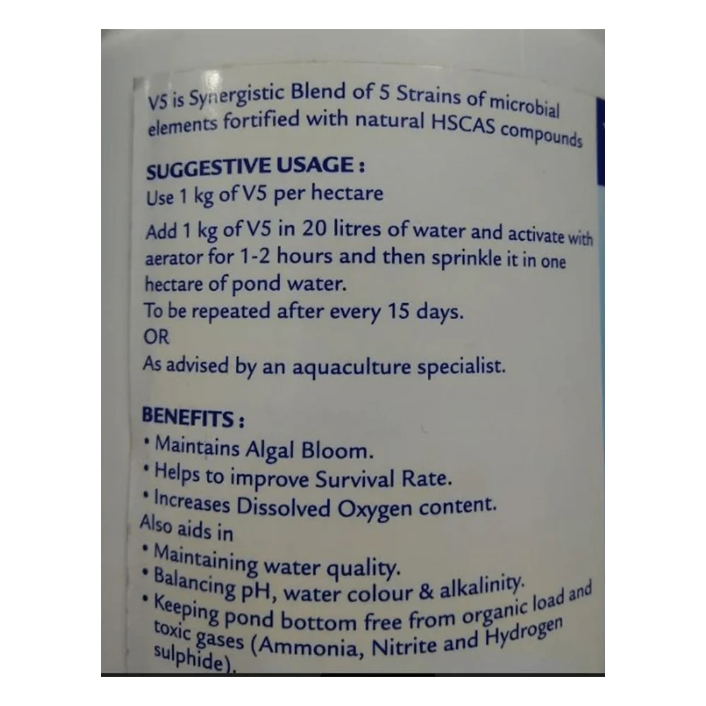 V5TM Powder helps in maintaining proper environment for Shrimp & Fish. Probiotics For Aquaculture Use; Not For Medicinal Use