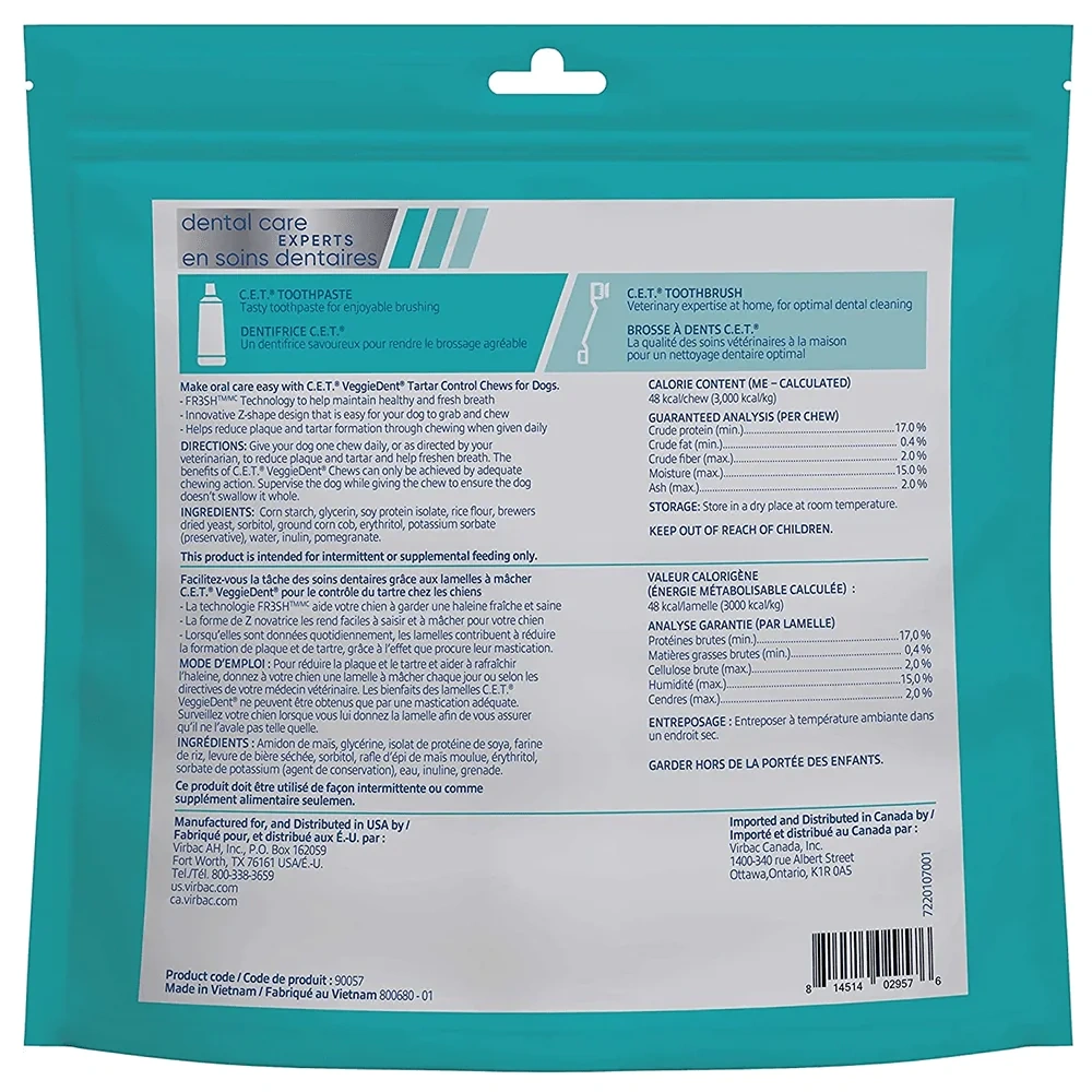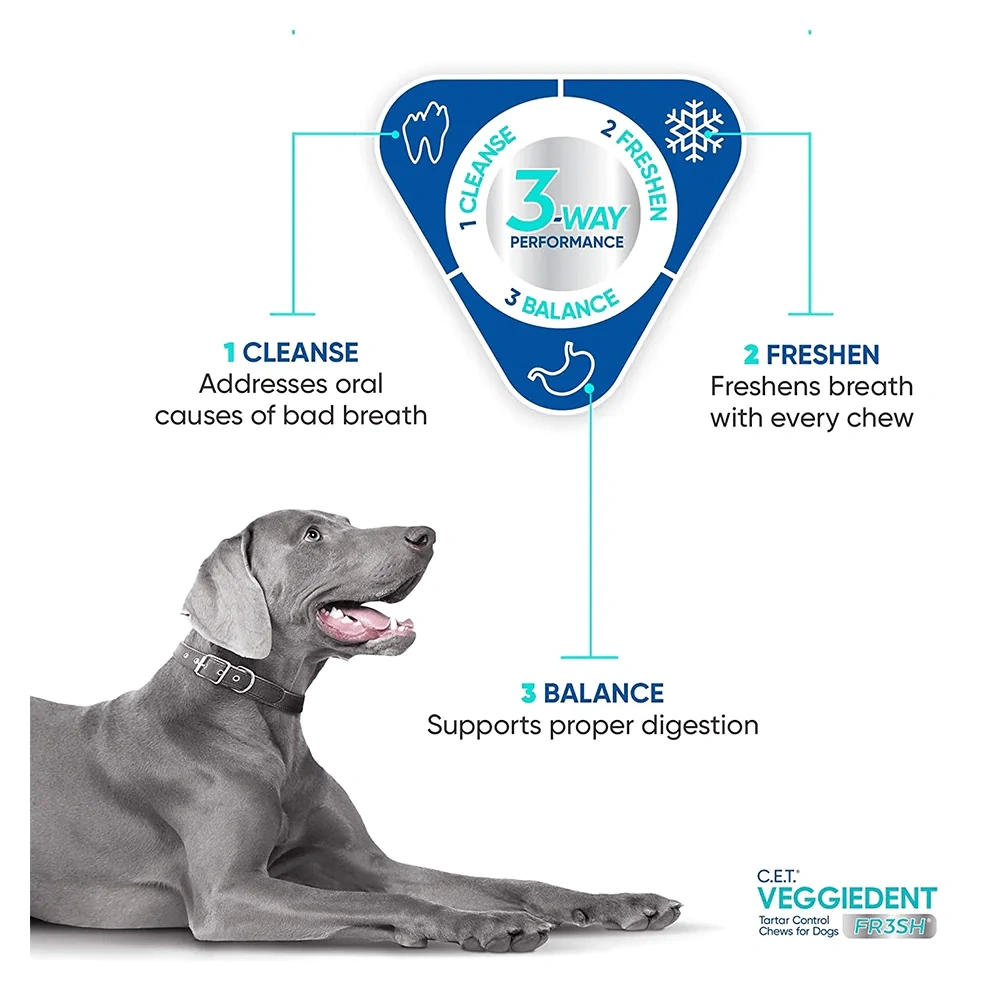 VEGGIEDENT® FR3SHTM is a dental chew for dogs that uses a unique FR3SH™ technology which targets bad breath and helps in removal of plaque and tartar from the dog’s teeth surfaces. This vet recommended dog dental chews offer an innovative formula to maintain oral hygiene. It comes in a unique Z-shape that enhances the chewing action, aids mechanical cleaning of the oral surfaces, and favors gum health. Recommendation for fresh and healthy breath and removal of plaque and tartar from the dog’s teeth surfaces. The innovative formula used in VEGGIEDENT® FR3SHTM dental chews for dogs aims to eliminate the 3 major oral and digestive factors of bad breath, thus maintaining a pleasant, fresh and healthy breath. VEGGIEDENT® FR3SHTM is a natural, plant-based dental chew, that contains no artificial or meat ingredients, is free of wheat and is easily digestible. Hence VEGGIEDENT® FR3SHTM is suitable and healthy for daily and long-term use; thus, freshening breath and supporting canine tartar removal.
