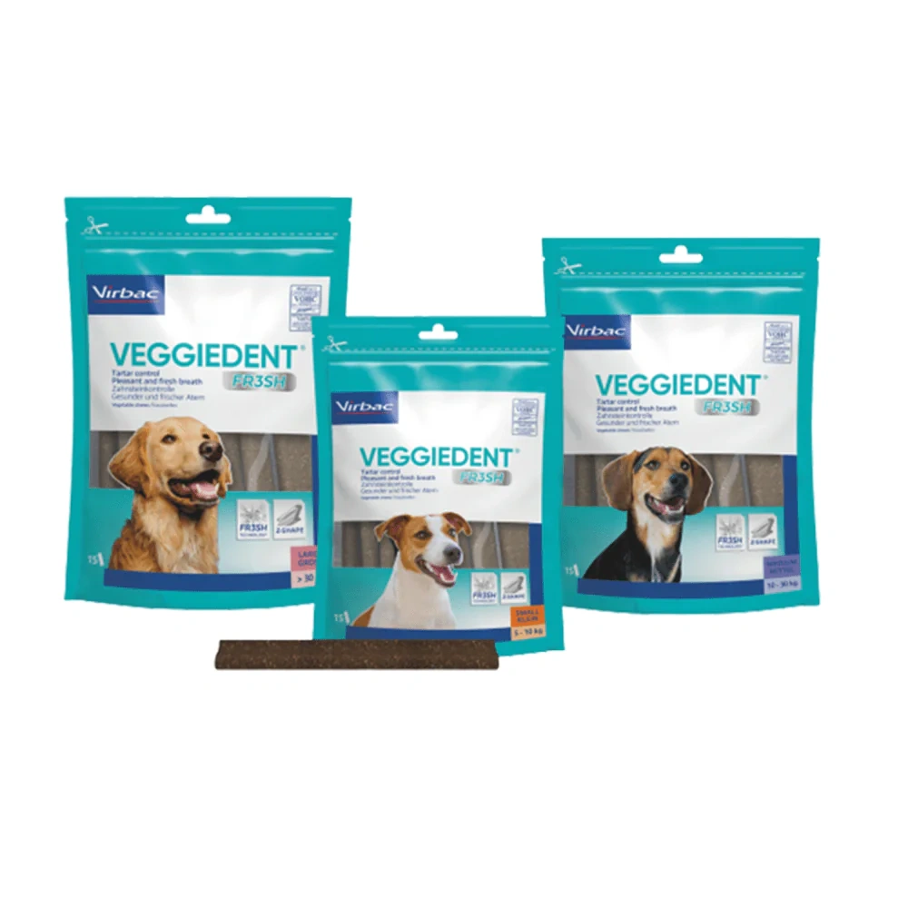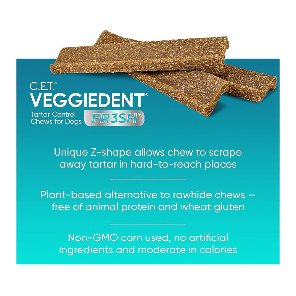 VEGGIEDENT® FR3SHTM is a dental chew for dogs that uses a unique FR3SH™ technology which targets bad breath and helps in removal of plaque and tartar from the dog’s teeth surfaces. This vet recommended dog dental chews offer an innovative formula to maintain oral hygiene. It comes in a unique Z-shape that enhances the chewing action, aids mechanical cleaning of the oral surfaces, and favors gum health. Recommendation for fresh and healthy breath and removal of plaque and tartar from the dog’s teeth surfaces. The innovative formula used in VEGGIEDENT® FR3SHTM dental chews for dogs aims to eliminate the 3 major oral and digestive factors of bad breath, thus maintaining a pleasant, fresh and healthy breath. VEGGIEDENT® FR3SHTM is a natural, plant-based dental chew, that contains no artificial or meat ingredients, is free of wheat and is easily digestible. Hence VEGGIEDENT® FR3SHTM is suitable and healthy for daily and long-term use; thus, freshening breath and supporting canine tartar removal.